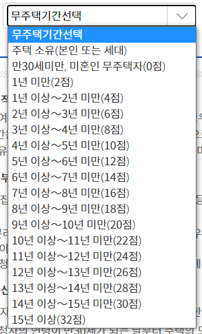 - 주택을 소유한 세대(분양권등 포함)와 만30세 미만. 미혼 무주택자는 0점