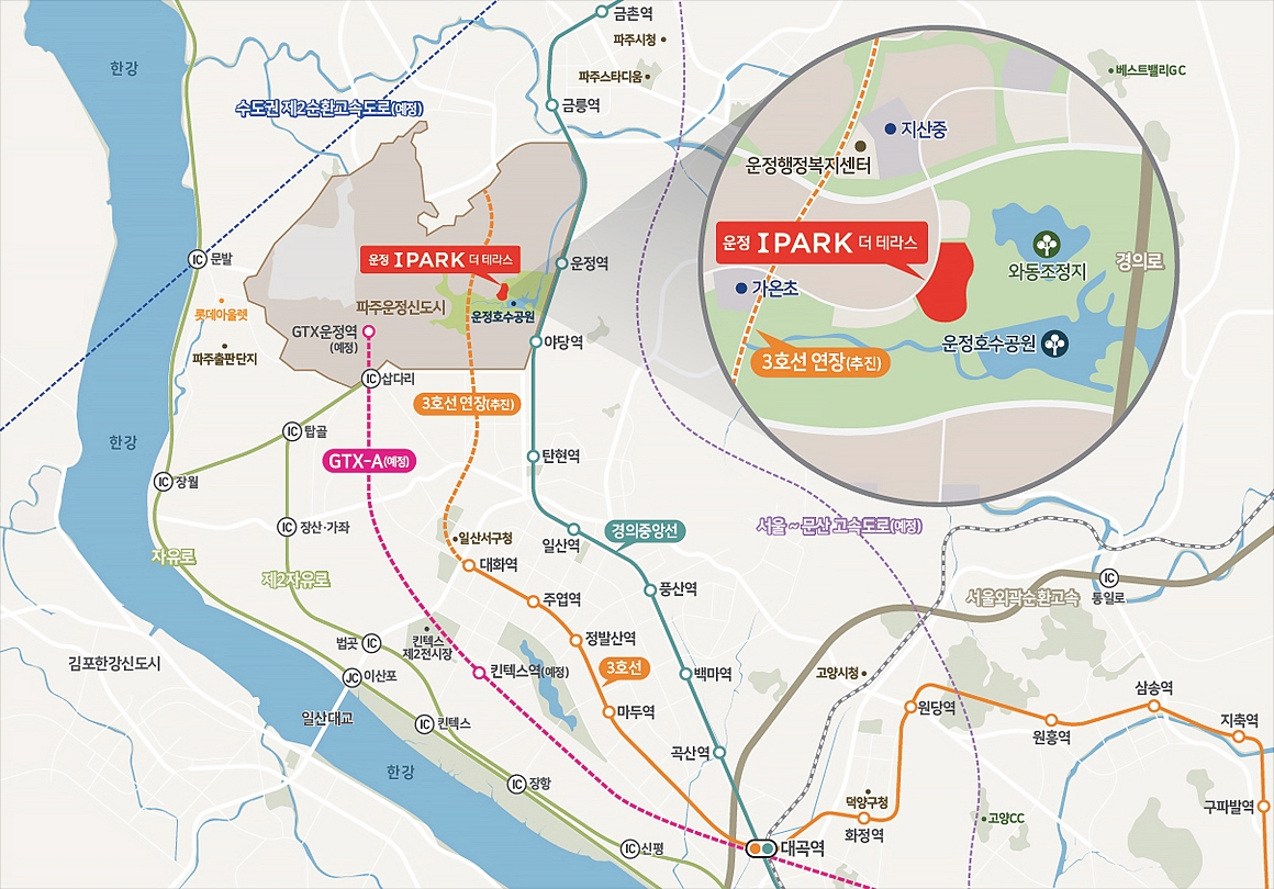 또 지하철 3호선 연장선 산업과 서울-문산고속도로 (2020년 예정), 김포~파주 간 제2외곽순환도로(2024년 예정) 등 광역 교통망 호재도 예정돼 있어 서울 및 수도권 전역으로 접근성은 더 향상될 전망이다.