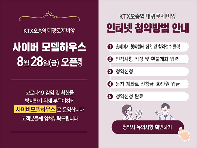 대광건영은 충북 청주시 오송읍 봉산리 오송바이오폴리스지구 B01블록에 조성하는 ‘KTX오송역 대광로제비앙’ 의 사이버 모델하우스를 오는 28일 오픈하고, 본격 분양에 나선다. 자세한 내용은 아래를 참고해주세요!!