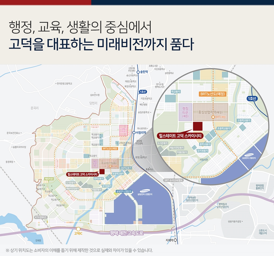 단지 인근에는 고덕신도시 2단계 개발사업의 핵심이라 할 수 있는 행정타운이 있고 판매·업무·의료·위락시설 등이 들어설 수 있는 중심상업지구도 맞닿아 있다. 서정리천 수변공원과 근린공원도 인근이라 주거환경도 쾌적하다. 삼성전자의 반도체 생산 공장인 평택캠퍼스가 인접해 직주근접도 가능하다.