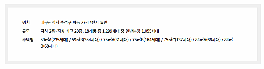 대구 수성구 파동 27-17번지 일대에 들어설 예정인 아파트로 지하2층부터 지상최고 28층까지 18개동으로 들어설 예정세대수가 1,299세대. 이중에서 일반분양 금회 물량이 1,055세대 입니다. 평형대는 가장 인기좋은 59 와 75 그리고 84