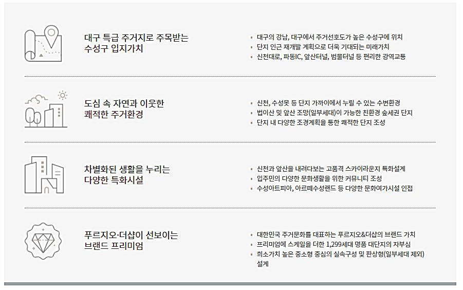 대구에서 주거지로 각광받고 있는 수성구 가치 그리고 쾌적한 자연환경과 다양한 문화, 쇼핑, 특화시설에 우리나라 1군 브랜드 푸르지오