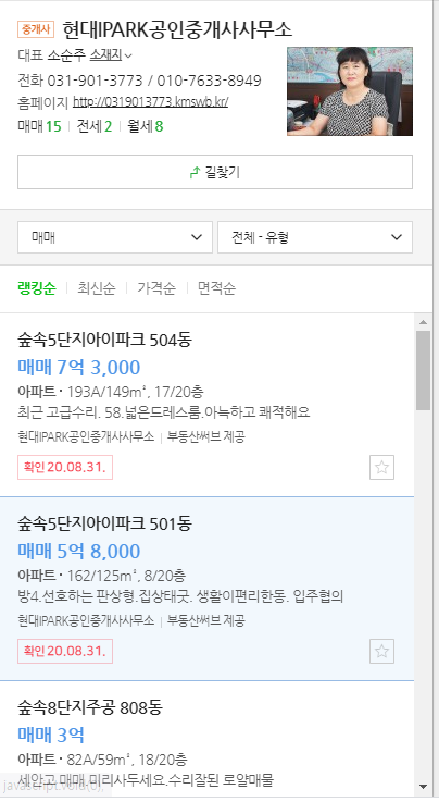 해당 중개업소의 매물만을 볼 수 있는 페이지를 들어오면 위에 프로필 정보와 함께 매물들이 아래에 보이는데요. 하나의 매물을 아무거나 클릭하거나 중개업소 명을 클릭하면 해당 매물의 인터넷주소 URL 나오는것을 확인할 수 있습니다. 아래 빨간 테두리처럼
