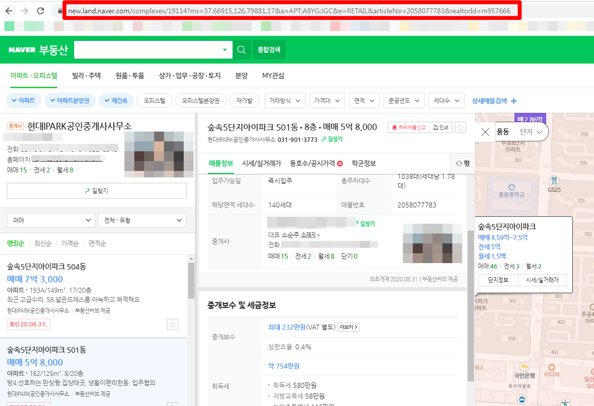 해당 중개업소의 매물만을 볼 수 있는 페이지를 들어오면 위에 프로필 정보와 함께 매물들이 아래에 보이는데요. 하나의 매물을 아무거나 클릭하거나 중개업소 명을 클릭하면 해당 매물의 인터넷주소 URL 나오는것을 확인할 수 있습니다. 아래 빨간 테두리처럼