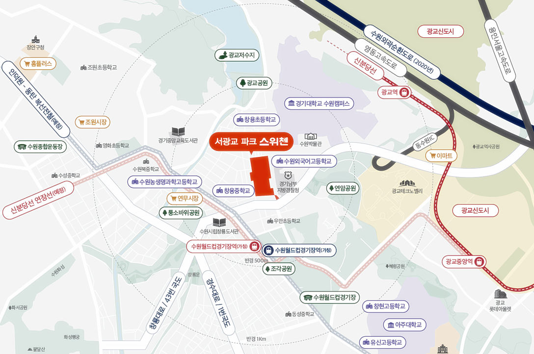 수원 장안구 원도심 내 들어서는 서광교 파크 스위첸은 창용초·중, 수원외고 등 교육시설이 인접해 있는데다 경기남부지방경찰청, 경기도교육청을 비롯한 다양한 행정기관과 수원월드컵경기장, 수원종합운동장 등 체육시설 및 이마트, 홈플러스 등의 생활 편의 시설도 쉽게 이용할 수 있다.