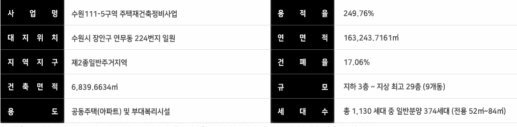 `서광교 파크 스위첸`은 지하 3층~지상 최고 29층, 총 9개 동, 전용면적 52~84㎡, 총 1130가구 규모의 브랜드 대단지로 이 중 이번 일반분양 대상은 전용 52~84㎡, 374가구이다. 내 집 마련과 동시에 출퇴근 시간을 줄이려는 수요자라면 주목할 만한 신규 분양단지이다. 경기도 수원시 장안구 연무동 수원 111-5구역 주택재건축을 통해 들어서는 ‘서광교 파크 스위첸’의 1순위 해당지역 청약을 진행한다.