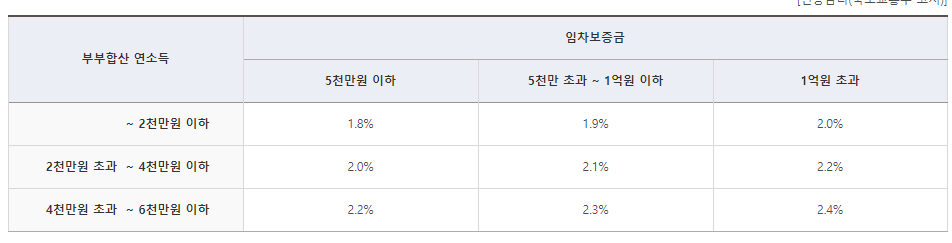부부합산 연소득임차보증금5천만원 이하5천만 초과 ~ 1억원 이하1억원 초과 ~ 2천만원 이하2천만원 초과 ~ 4천만원 이하4천만원 초과 ~ 6천만원 이하