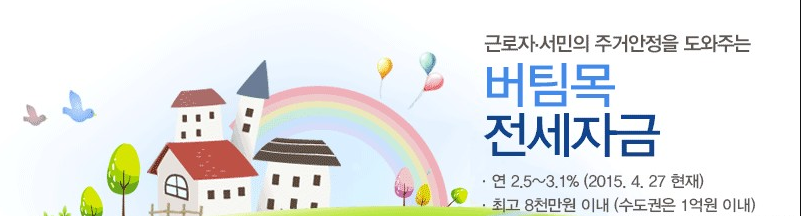 전세자금을 저금리(연 2.3~2.9%)로 전세보증금의 70%까지 대출해 드립니다. 수도권 1억2천만 원, 지방 8천만 원 한도이다.