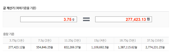 중량 기준으로 1돈은 3.75g으로 계산기에 3.75 입력하면 매매기준율 기준으로 277,423.13원 나오는 결과값을 얻을 수 있습니다. 우리가 실제 사고 팔때의 기준 가격이며 살때는 이보다 비싸고 팔때는 이보다 싸게 팔게 됩니다. 왜? 금거래소의 수익이라는 것은 이렇게 사고 팔때의 차익이기 때문입니다. 자세한 내용은 아래를 참고해주세요!!