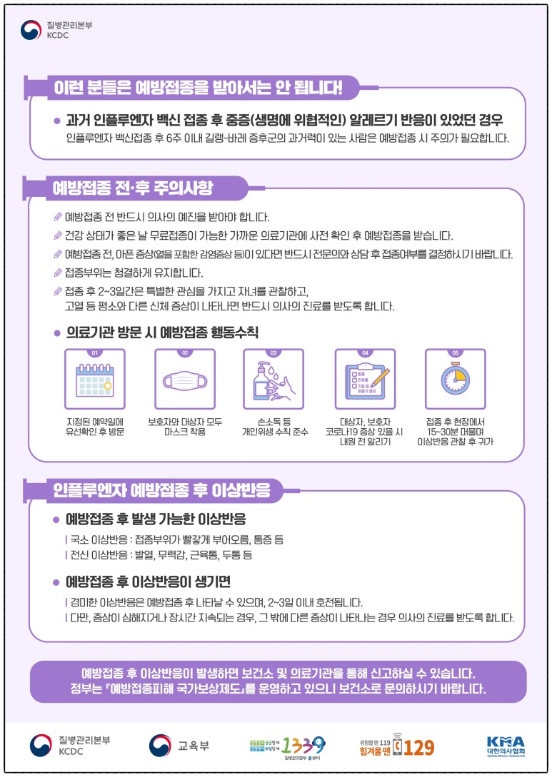 코로나19와 독감이 동시에 유행하면 안 됩니다. 그러하기에 독감 예방 접종은 필수입니다. |