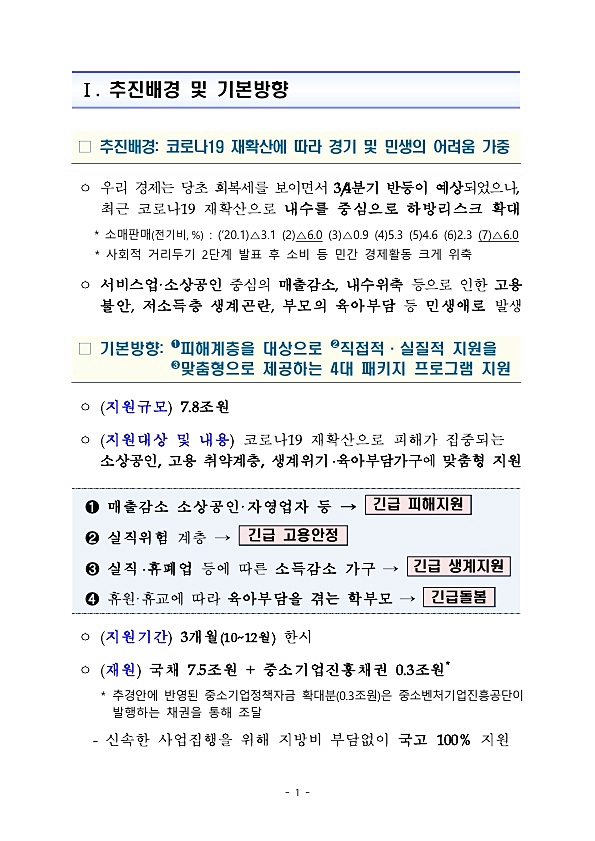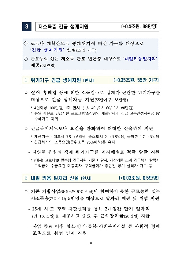 2차 재난지원금 선별지급 : 저소득 장기실업자 1인당 생활안정자금 100만원 지원