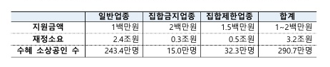 0.5조원 | 3.2조원 | 수혜 소상공인 수 | 243.4만명 | | 15.0만 명 323만명 | 290.7만명)