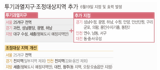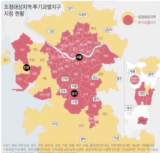 이미 조정대상지역인 지역들을 한 단계 격상시킨 것이다. 경기 성남 수정구, 수원, 안양, 안산 단원구, 구리, 군포, 의왕, 용인 수지·기흥, 화성(동탄2만 지정) 지역과 인천 연수·남동·서구, 대전 동·중·서·유성구 등이 이번에 새로 투기과열지구로 지정됐다. 앞서 말했지만 인천 서구 등이 모두 투기과열지구에 포함된 것은 잘 이해가 가지 않는 대목이다.