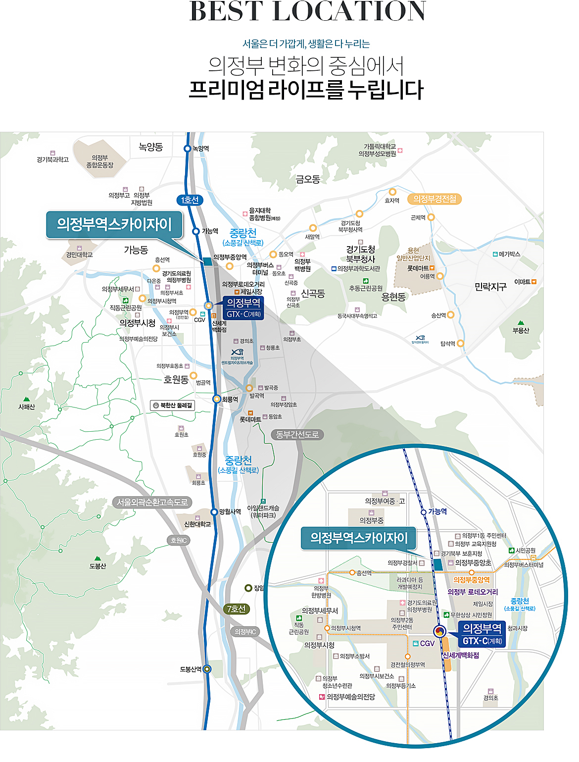 의정부역스카이자이는 지하철 1호선 의정부역, 경전철 의정부중앙역 역세권 프리미엄을 누릴 수 있다.