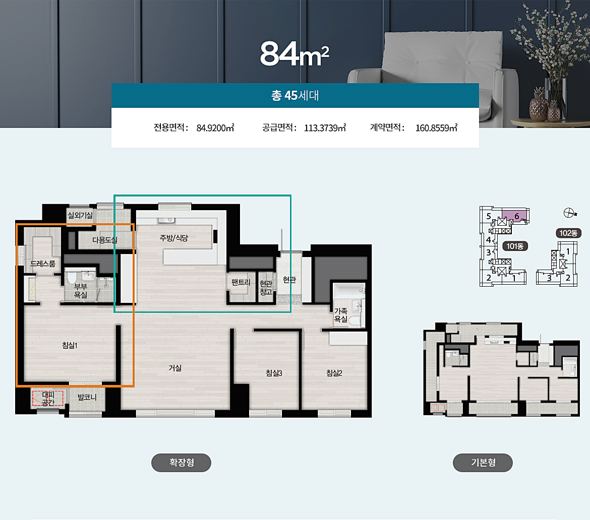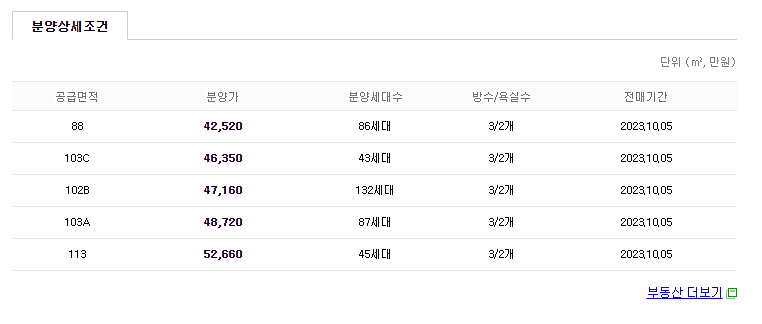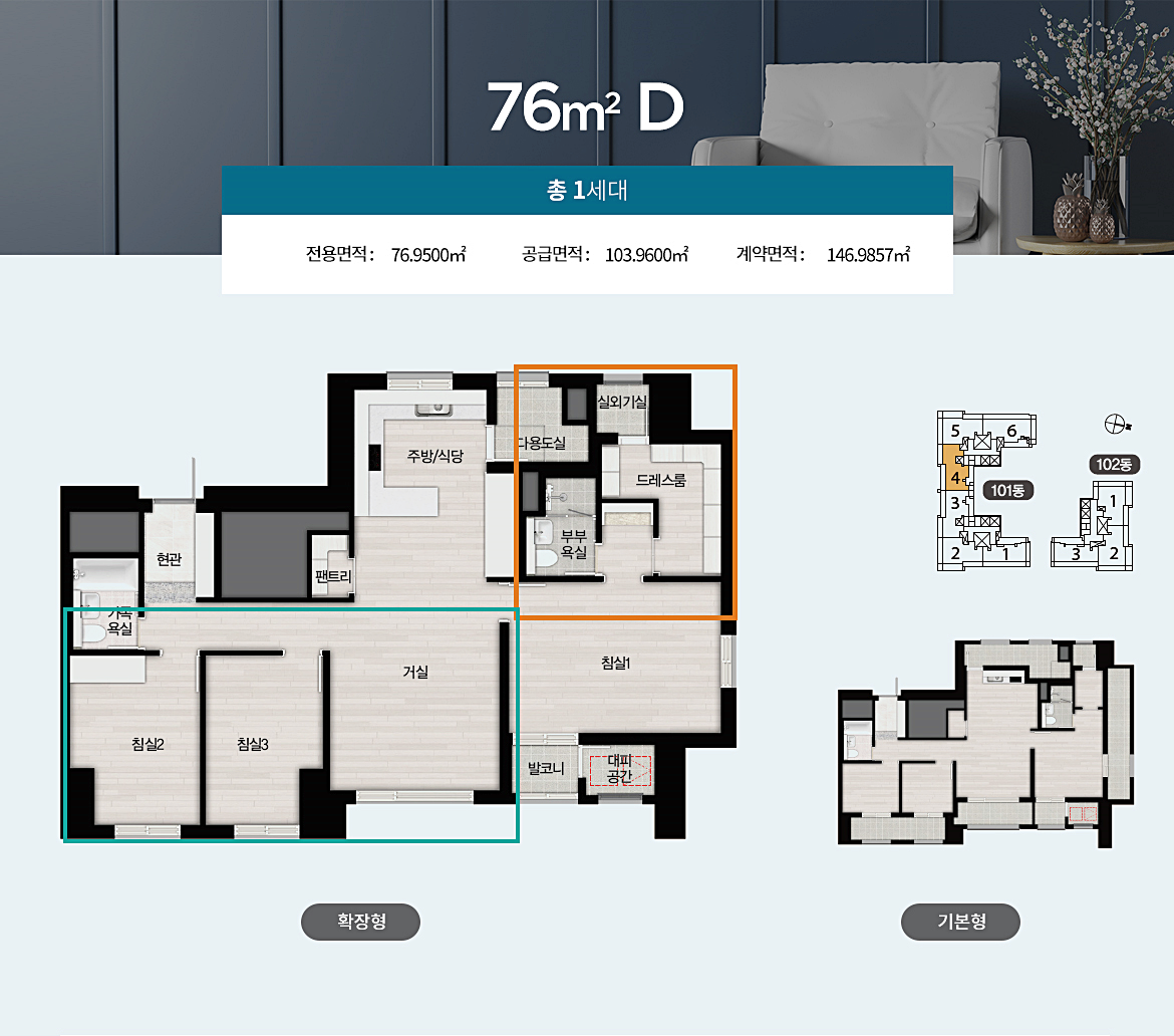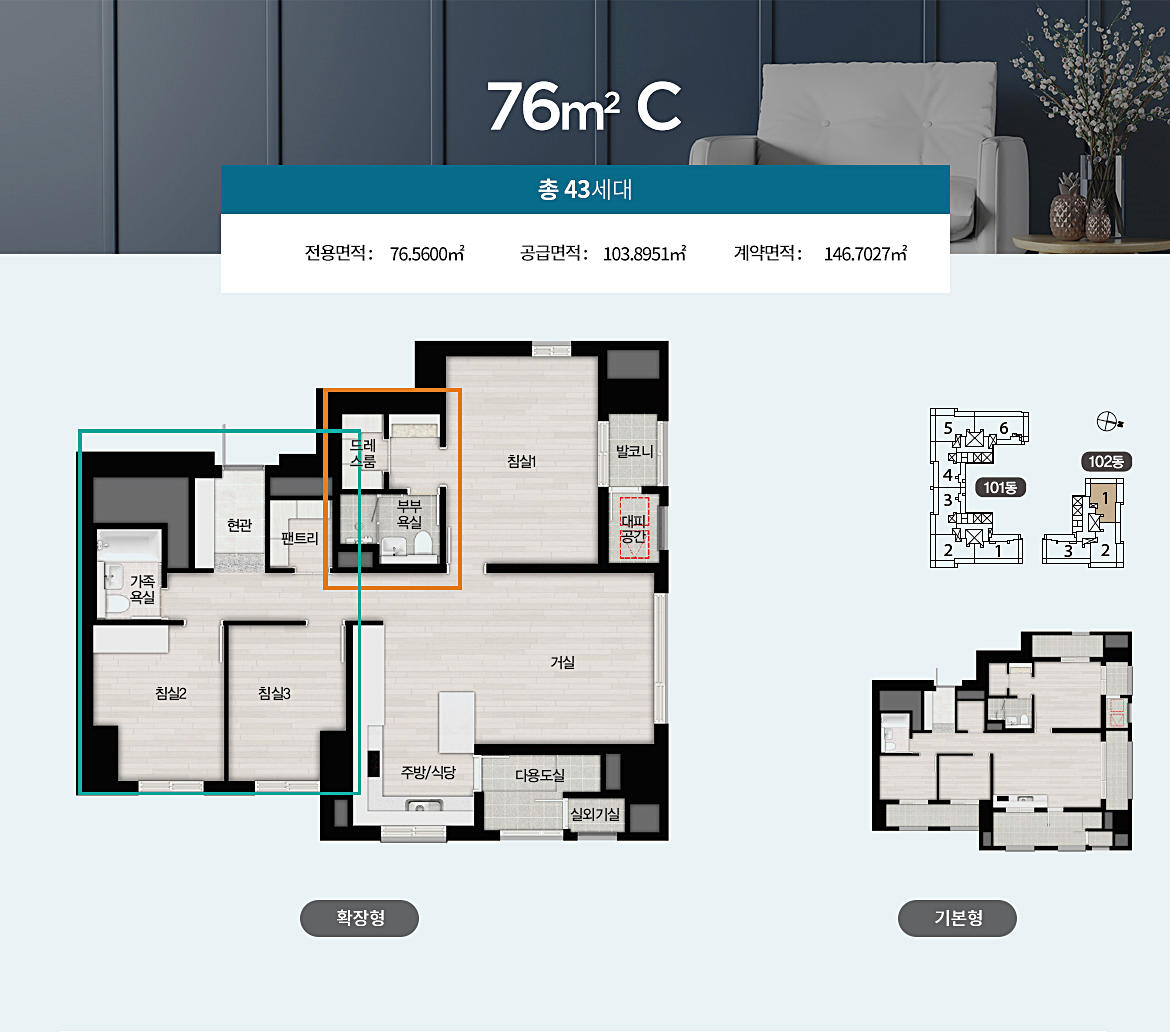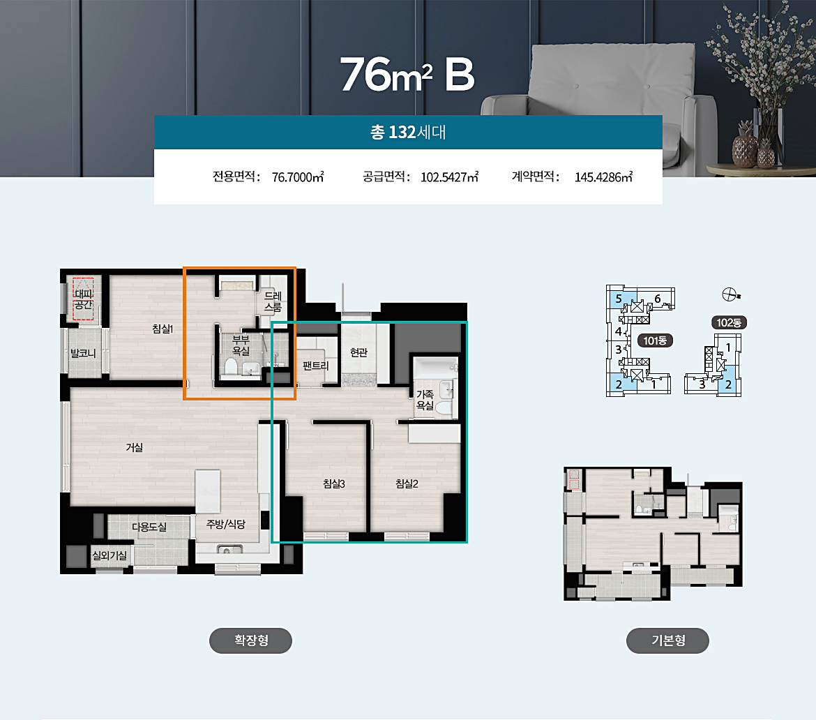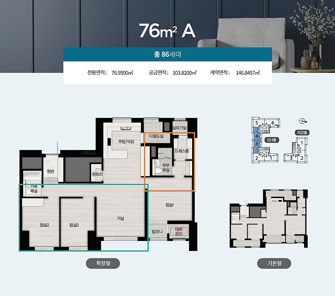 전 타입 소비자들의 선호도 높은 중소형 타입으로만 구성되며, 전용면적별 일반분양은 ▲66㎡ 86가구 ▲76㎡ 262가구 ▲84㎡ 45가구다.