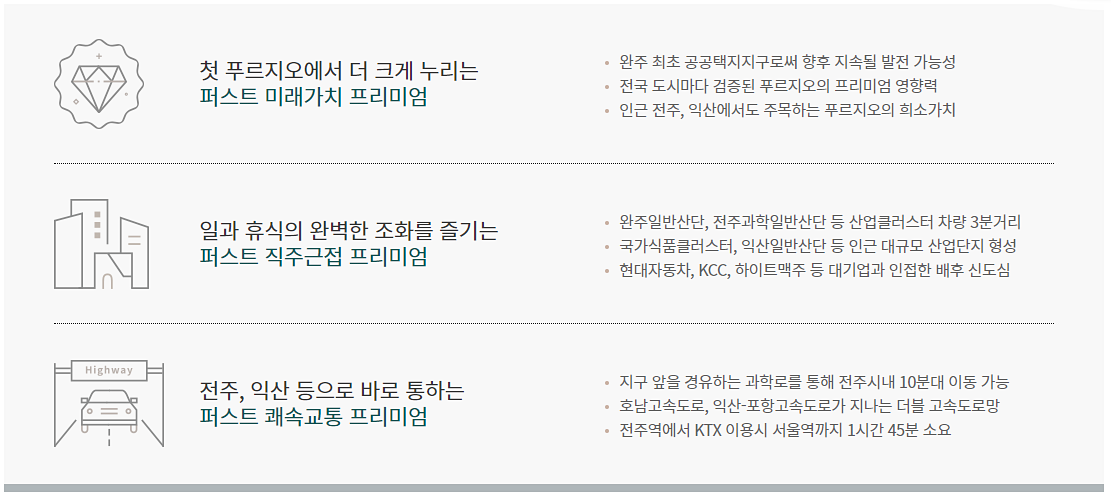 특히 완주 푸르지오 더 퍼스트는 삼봉지구 내 첫 민간분양 아파트로 입주 시점에 완성된 택지지구 인프라를 누릴 수 있을 것으로 기대된다.