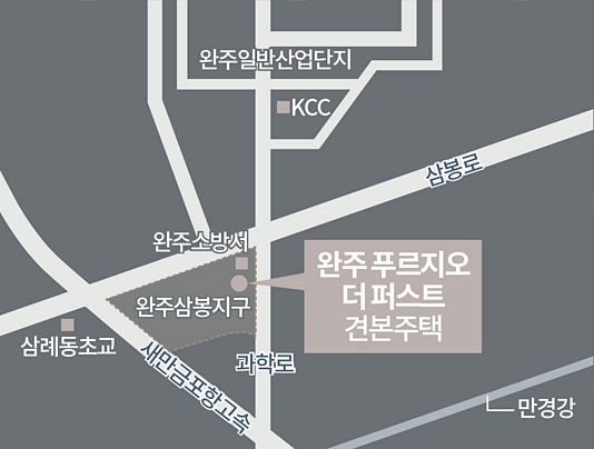 완주 푸르지오 더 퍼스트가 들어서는 삼봉지구는 삼례읍과 봉동읍 일원 총 91만4000㎡에 조성되는 지역 첫 공공주택지구다. 완주군 핵심 추진사업으로 아파트(5826가구), 단독주택(233가구) 등이 들어서는 미니신도시로 조성이 한창이다.