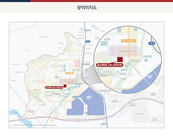 힐스테이트 고덕 스카이시티는 고덕국제신도시(이하 고덕신도시) 내 핵심 입지에 조성되는 최고층 랜드마크 단지다. 이 단지는 행정타운과 중심상업시설, 근린공원 등 다양한 생활 인프라가 집중된 고덕신도시 중심권역에 위치한다. 특히, 고덕신도시에서 처음으로 선보이는 49층 높이의 주거복합단지라는 점에서 수요자들의 많은 관심을 받고 있다.