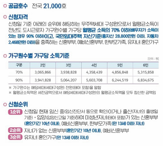 지원 대상은 전년도 도시근로자 월평균 소득의 70%(배우자가 소득이 있는 경우 90%) 이하이고 총자산 2억8800만 원, 자동차 2468만 원 이하의 자산을 보유한 무주택 세대구성원이다.