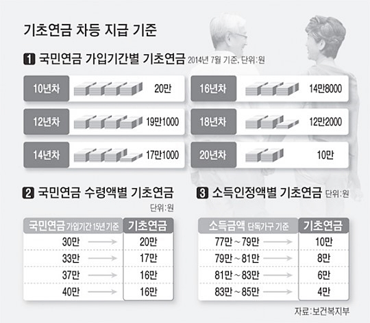 - 단독가구, 부부 1인 수급 가구는 기준연금액의 10%, 부부 2인 수급 가구는 기준연금액의 20%를 최저연금액으로 지급
