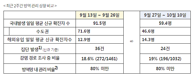 최근 2주간 국내 발생 확진자 수가 하루 평균 60명 미만으로 줄고
