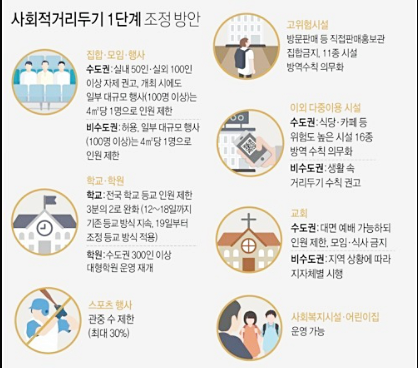 예배실 좌석 수의 30% 이내로 대면예배를 허용한다. 다만 식사·소모임·행사는 금지는 유지된다. 또 1단계 하에서는 규모와 관계없이 모임·행사 등을 열 수 있지만, 수도권은 실내 50인·실외 100인 이상 집합·모임·행사 자제가 권고된다.