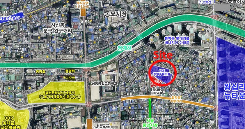 입지적 요건 역시 뛰어나다. 단지 앞에는 청계천이 위치하여 쾌적한 생활환경을 갖췄다. 또한 지하철 2호선과 6호선이 지나는 신당역과 지하철 1호선과 6호선이 지나는 동묘앞역이 도보로 이동 가능한 거리에 있는 더블 역세권에 위치해 있으며, 내부순환로 마장IC를 통해 서울뿐만 아니라 인근 지역으로 쉽게 이동할 수 있는 쾌속 교통망을 갖추고 있다.