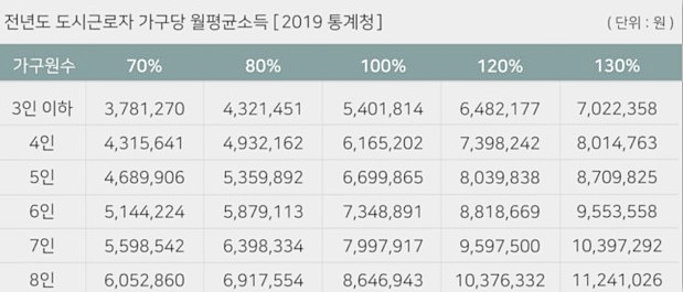 도시근로자 월 평균 소득의 100%(맞벌이 120%) 기준을 유지