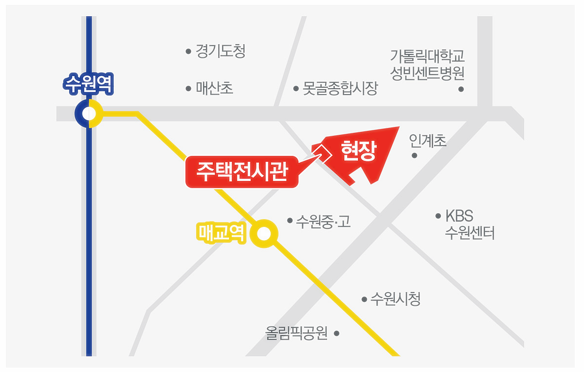 사업 부지 반경 1㎞ 내에 교통, 교육, 편의시설 등 각종 생활 인프라도 완비돼 있다. 우선 인근에 위치한 분당선 매교역을 이용하면 1호선 및 KTX 경부선 환승이 가능한 수원역까지 1정거장이면 이동할 수 고, 경수대로, 매산로 등 도로망을 통해 수원 전역 및 수도권 전 지역으로 이동이 수월하다.