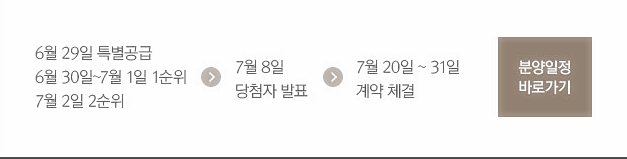 청약일정은 오는 29일 특별공급을 시작으로 오는 30일 1순위 당해 지역, 7월 1일 1순위 기타지역, 2일 2순위 청약을 받고, 당첨자 발표는 7월 8일이며, 정당계약은 오는 20일부터 31일까지 12일 동안 진행된다.