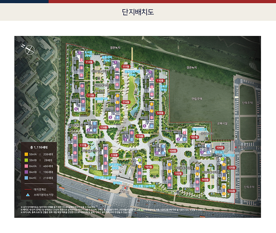 지하 2층·지상 20층, 18개 동 규모로 전용면적 59~84㎡ 총 1,116가구로 구성된다. 전용면적별로 보면 △59㎡A 208가구 △59㎡B 28가구 △84㎡A 466가구 △84㎡B 196가구 △84㎡C 218가구 등이다. 이 중 일반분양은 166가구이고, 전체의 85% 수준인 950가구는 특별공급으로 공급된다.