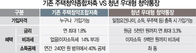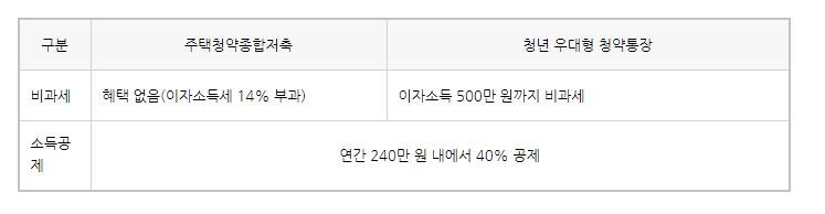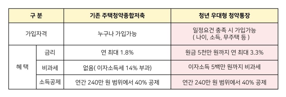 [주택청약종합저축과 청년 우대형 청약통장 혜택 비교]