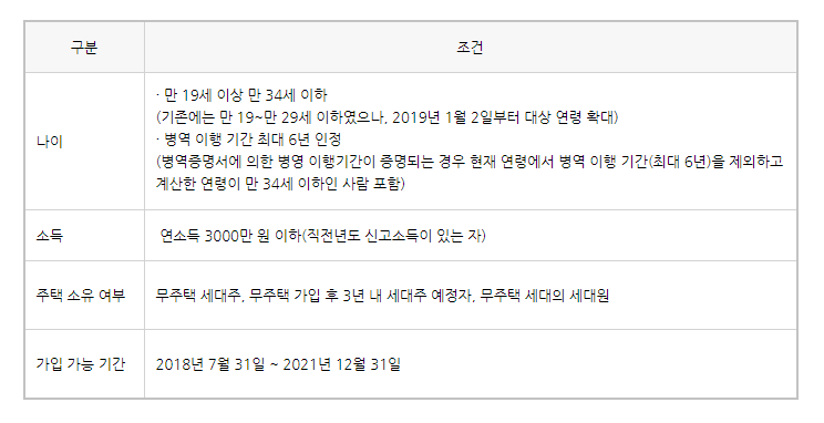 만 19세 이상 만 34세 이하 청년(병역 기간은 최대 6년까지 별도로 인정, 2019년 1월 2일부터)