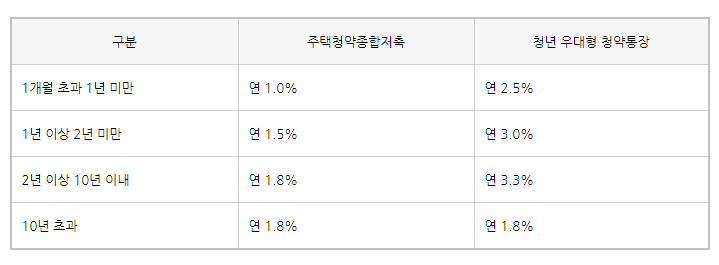 [주택청약종합저축과 청년 우대형 청약통장 이자율 비교]