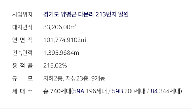 경기 양평군 다문리 공동1블럭에 선보이는 이 단지는 지하 2층, 지상 최고 23층, 9개동, 총 740가구 규모로 조성된다. 전가구 실수요자 선호도 높은 전용면적 59~84㎡의 중소형으로 구성됐다.
