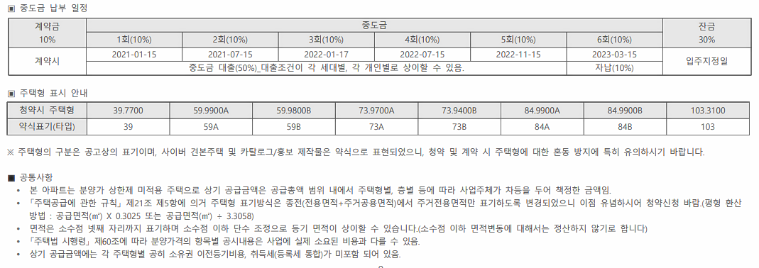 중도금 대출이 필요한 경우 계약자가 계약체결 후 지정된 중도금대출 협약은행과 중도금대출 계약을 별도로 체결하여야 함.(세부적인 대출신청일정 등은 별도 안내 예정) Ÿ 대출 미신청자와 본인의 부적격 사유로 인하여 대출이 불가한 계약자는 상기 납부일정에 맞추어 본인이 직접 납부하여야 함.(미납 시 연체료 부과됨) Ÿ 계약자는 본 아파트의 분양조건(중도금이자 후불제)에 대하여 충분히 인지하여야 하며, 중도금 대출 미신청, 대출비율 축소, 대출 불가시 계약자 본인 책임하에 분양대금을 정해진 납부일정에 맞춰 납부하여야 하며, 미납부시 공급계약서에 따라 연체료 발생 및 계약해제 사유가 될 수 있음.(계약해제시 위약금이 발생하오니 신중하게 계약에 임하시길 바람)