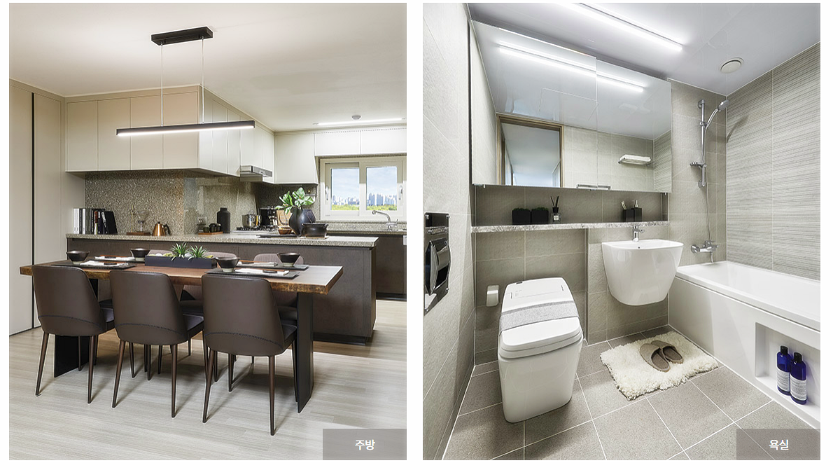 실내는 입주민들의 선호도를 반영해 창고형 팬트리, 현관 수납장, 안방 드레스룸, 다목적실 등 풍부한 수납공간이 마련되고 효율적인 기능 및 동선 확보를 고려한 'ㄷ'자형 주방도 일부 세대에 적용된다. 특히 전용 39㎡는 별도의 침실 이외에도 거실과 주방 사이에 중문이 설치돼 침실로도 활용이 가능하다. 뿐만 아니라 욕실에 샤워 부스를 설치해 편의성을 극대화했다.