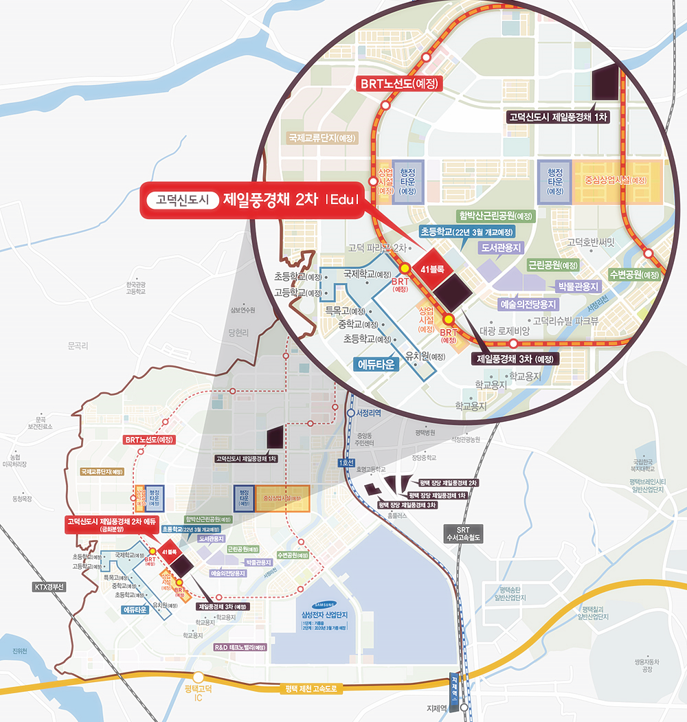 단지가 들어서는 고덕신도시 에듀타운(예정)은 국제학교와 특목고를 비롯해 유치원, 초, 중, 고등학교까지 들어설 예정인 교육 특화 구역이다.