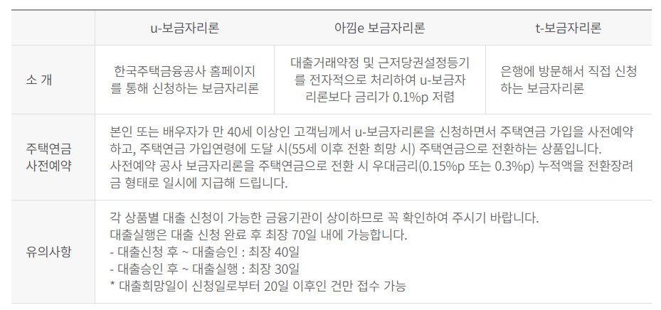 본인 또는 배우자가 만 40세 이상인 고객님께서 u-보금자리론을 신청하면서 주택연금 가입을 사전예약하고, 주택연금 가입연령에 도달 시(55세 이후 전환 희망 시) 주택연금으로 전환하는 상품입니다.