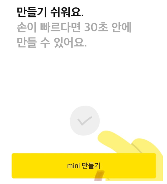 미니 카드 만들기 클릭하고 발급 순서대로 따라가시면 됩니다. 30초 만에 만들 수 있다고 하니 손쉽게 만들 수 있는 카카오뱅크만의 장점입니다. 그렇다면 이제 성인이 만들 수 있는 체크카드에 대해서 알아볼까요.