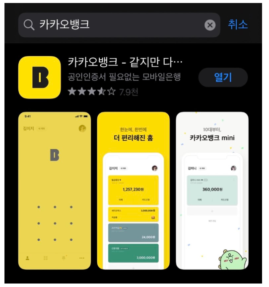 그렇다면 이제 발급받는 방법에 대해서 정리해 볼께요. 먼저 카카오뱅크 어플이 있어야 합니다. 없으시다면 앱스토어에서 어플을 깔아주세요.