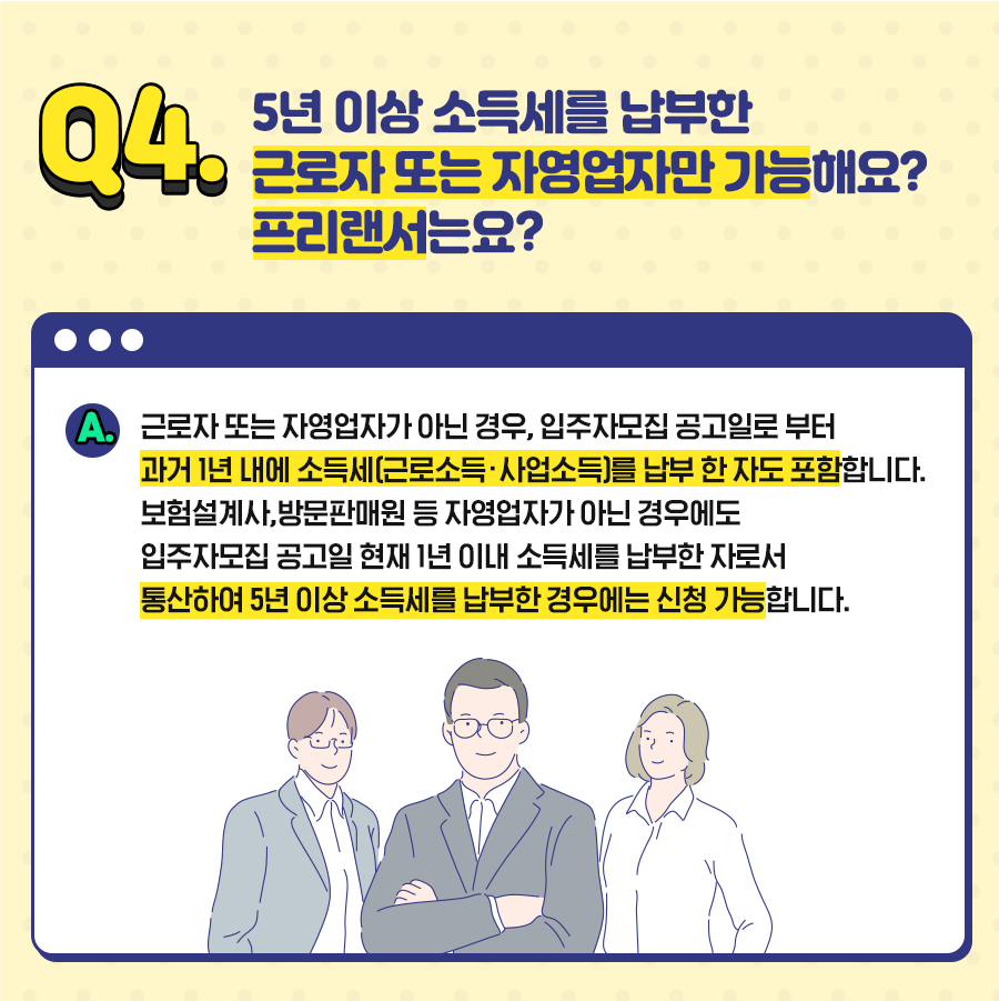 Q. 5년 이상 소득세를 납부한 근로자 또는 자영업자만 가능해요? 프리랜서는요?