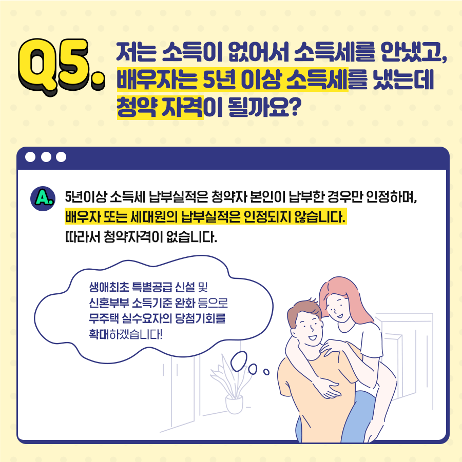 Q. 저는 소득이 없어서 소득세를 안냈고, 배우자는 5년 이상 소득세를 냈는데 청약 자격이 될까요?