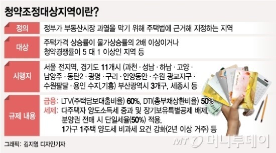 조정대상지역은 부동산시장 과열을 막기 위해 정부가 주택법에 근거해 지정하는 지역을 말한다. 주택가격 상승률이 물가상승률의 2배 이상이거나 청약경쟁률이 5 대 1 이상인 곳 등이 해당된다.