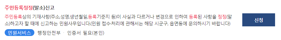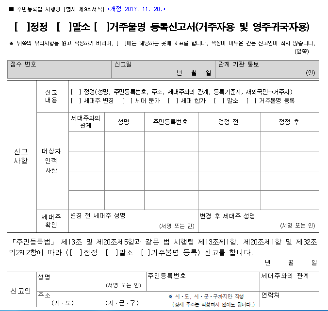 동사무소를 방문하여 주민등록 정정신청을 한다. 양식은 위와 같습니다. 다른 주소로 이동시 전입신고를 새롭게 합니다.