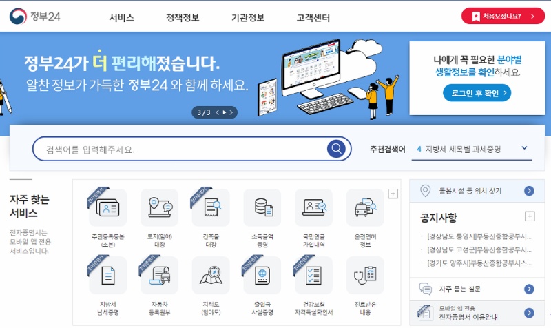 정부24 홈페이지를 들어가면 위와 같은 화면을 볼 수 있습니다.