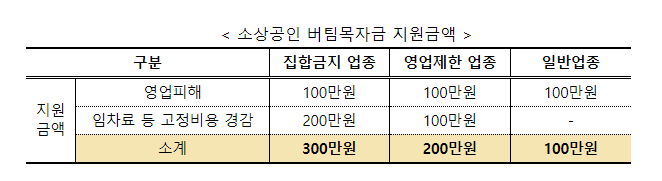 ❷ (집합금지·영업제한) 중앙재난안전대책본부・지방자치단체의 방역강화로 집합금지 또는 영업제한된 소상공인에 각각 300만원, 200만원