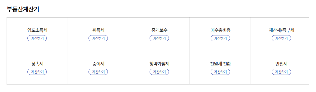114 사이트 들어왔으면 상단 검색창에 계산기 입력해 보세요. 아래와 같이 바로 다양한 부동산계산기 메뉴를 볼 수 있습니다.