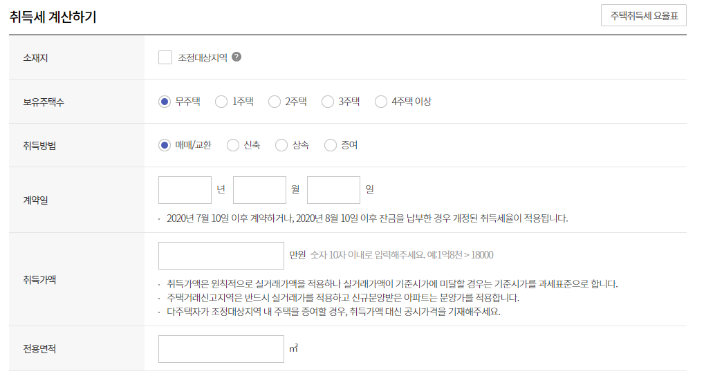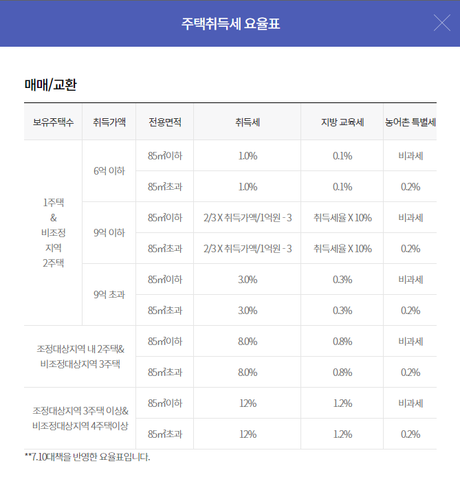 계약일 : 2020년 7월 10일 이후 계약하거나, 2020년 8월 10일 이후 잔금을 납부한 경우 개정된 취득세율이 적용됩니다.