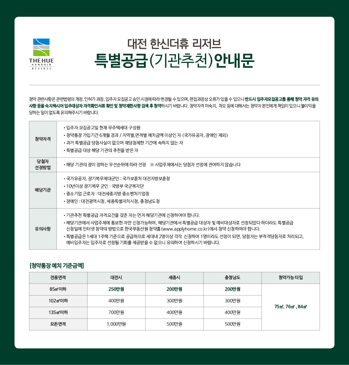 한신더휴 리저브는 대전 중구 선화동 103-1번지 일원에 들어서는 주상복합 단지다. 지하 5층~지상 최고 49층 3개 동 규모로, 아파트 418가구 및 상업시설로 구성된다. 전용면적 별로는 75㎡ 127가구, 76㎡ 43가구, 84㎡A 89가구, 84㎡B 159가구 등이다.